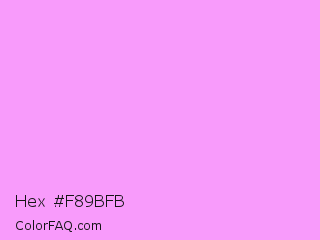 Hex #f89bfb Color is a light magenta color and the nearest color is Rich Brilliant Lavender #f1a7fe. Hex code #f89bfb and RGB value is rgb(248,155,251). In RGB color space, this color is composed of 97% red, 61% green, 98% blue, In CMYK color space, this color is composed of 1% cyan, 38% magenta, 0% yellow , 2% black , In HSL color space, this color has a hue angle of 298° , 92% saturation and 80% lightness.