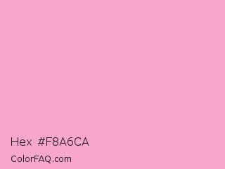 Hex #f8a6ca Color is a very light rose color and the nearest color is Illusion #f6a4c9. Hex code #f8a6ca and RGB value is rgb(248,166,202). In RGB color space, this color is composed of 97% red, 65% green, 79% blue, In CMYK color space, this color is composed of 0% cyan, 33% magenta, 19% yellow , 3% black , In HSL color space, this color has a hue angle of 334° , 85% saturation and 81% lightness.