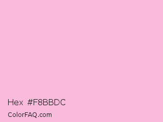 Hex #f8bbdc Color is a very light rose color and the nearest color is Cupid #fbbeda. Hex code #f8bbdc and RGB value is rgb(248,187,220). In RGB color space, this color is composed of 97% red, 73% green, 86% blue, In CMYK color space, this color is composed of 0% cyan, 25% magenta, 11% yellow , 3% black , In HSL color space, this color has a hue angle of 328° , 81% saturation and 85% lightness.
