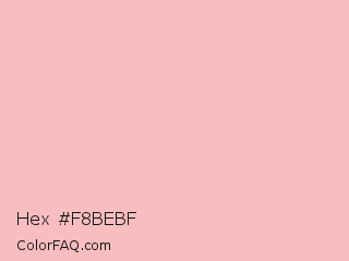 Hex #f8bebf Color is a very light red color and the nearest color is Spanish Pink #f7bfbe. Hex code #f8bebf and RGB value is rgb(248,190,191). In RGB color space, this color is composed of 97% red, 75% green, 75% blue, In CMYK color space, this color is composed of 0% cyan, 23% magenta, 23% yellow , 3% black , In HSL color space, this color has a hue angle of 359° , 81% saturation and 86% lightness.