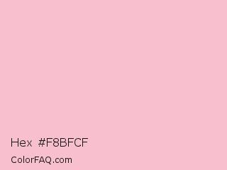 Hex #f8bfcf Color is a very light rose color and the nearest color is Orchid Pink #f2bdcd. Hex code #f8bfcf and RGB value is rgb(248,191,207). In RGB color space, this color is composed of 97% red, 75% green, 81% blue, In CMYK color space, this color is composed of 0% cyan, 23% magenta, 17% yellow , 3% black , In HSL color space, this color has a hue angle of 343° , 80% saturation and 86% lightness.
