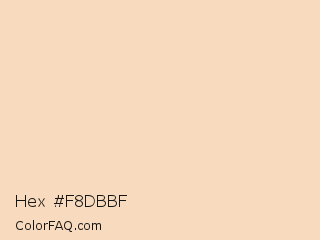 Hex #f8dbbf Color is a very light orange color and the nearest color is Very Pale Orange #ffdfbf. Hex code #f8dbbf and RGB value is rgb(248,219,191). In RGB color space, this color is composed of 97% red, 86% green, 75% blue, In CMYK color space, this color is composed of 0% cyan, 12% magenta, 23% yellow , 3% black , In HSL color space, this color has a hue angle of 29° , 80% saturation and 86% lightness.