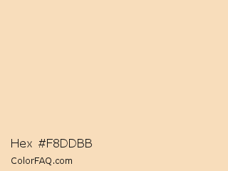 Hex #f8ddbb Color is a very light orange color and the nearest color is Dairy Cream #f9e4bc. Hex code #f8ddbb and RGB value is rgb(248,221,187). In RGB color space, this color is composed of 97% red, 87% green, 73% blue, In CMYK color space, this color is composed of 0% cyan, 11% magenta, 25% yellow , 3% black , In HSL color space, this color has a hue angle of 33° , 81% saturation and 85% lightness.