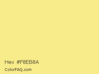 Hex #f8eb8a Color is a light yellow color and the nearest color is Sweet Corn #fbea8c. Hex code #f8eb8a and RGB value is rgb(248,235,138). In RGB color space, this color is composed of 97% red, 92% green, 54% blue, In CMYK color space, this color is composed of 0% cyan, 5% magenta, 44% yellow , 3% black , In HSL color space, this color has a hue angle of 53° , 89% saturation and 76% lightness.