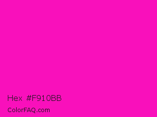 Hex #f910bb Color is a normal magenta color and the nearest color is Shocking Pink #fc0fc0. Hex code #f910bb and RGB value is rgb(249,16,187). In RGB color space, this color is composed of 98% red, 6% green, 73% blue, In CMYK color space, this color is composed of 0% cyan, 94% magenta, 25% yellow , 2% black , In HSL color space, this color has a hue angle of 316° , 95% saturation and 52% lightness.