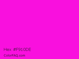 Hex #f910de Color is a normal magenta color and the nearest color is Hot Magenta #ff1dce. Hex code #f910de and RGB value is rgb(249,16,222). In RGB color space, this color is composed of 98% red, 6% green, 87% blue, In CMYK color space, this color is composed of 0% cyan, 94% magenta, 11% yellow , 2% black , In HSL color space, this color has a hue angle of 307° , 95% saturation and 52% lightness.