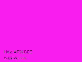 Hex #f91dee Color is a normal magenta color and the nearest color is Hot Magenta #ff1dce. Hex code #f91dee and RGB value is rgb(249,29,238). In RGB color space, this color is composed of 98% red, 11% green, 93% blue, In CMYK color space, this color is composed of 0% cyan, 88% magenta, 4% yellow , 2% black , In HSL color space, this color has a hue angle of 303° , 95% saturation and 55% lightness.