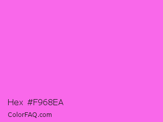 Hex #f968ea Color is a light magenta color and the nearest color is Pink Flamingo Crayola #ff66ff. Hex code #f968ea and RGB value is rgb(249,104,234). In RGB color space, this color is composed of 98% red, 41% green, 92% blue, In CMYK color space, this color is composed of 0% cyan, 58% magenta, 6% yellow , 2% black , In HSL color space, this color has a hue angle of 306° , 92% saturation and 69% lightness.