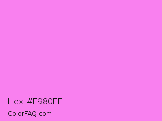 Hex #f980ef Color is a light magenta color and the nearest color is Light Fuchsia Pink #f984ef. Hex code #f980ef and RGB value is rgb(249,128,239). In RGB color space, this color is composed of 98% red, 50% green, 94% blue, In CMYK color space, this color is composed of 0% cyan, 49% magenta, 4% yellow , 2% black , In HSL color space, this color has a hue angle of 305° , 91% saturation and 74% lightness.