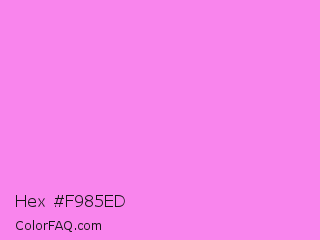 Hex #f985ed Color is a light magenta color and the nearest color is Light Fuchsia Pink #f984ef. Hex code #f985ed and RGB value is rgb(249,133,237). In RGB color space, this color is composed of 98% red, 52% green, 93% blue, In CMYK color space, this color is composed of 0% cyan, 47% magenta, 5% yellow , 2% black , In HSL color space, this color has a hue angle of 306° , 91% saturation and 75% lightness.