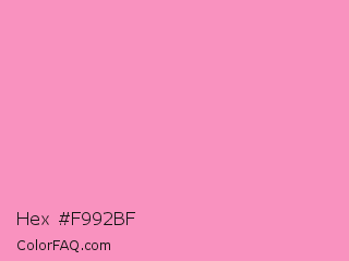 Hex #f992bf Color is a light rose color and the nearest color is Pastel Magenta #f49ac2. Hex code #f992bf and RGB value is rgb(249,146,191). In RGB color space, this color is composed of 98% red, 57% green, 75% blue, In CMYK color space, this color is composed of 0% cyan, 41% magenta, 23% yellow , 2% black , In HSL color space, this color has a hue angle of 334° , 90% saturation and 77% lightness.