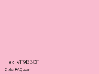 Hex #f9bbcf Color is a very light rose color and the nearest color is Orchid Pink #f2bdcd. Hex code #f9bbcf and RGB value is rgb(249,187,207). In RGB color space, this color is composed of 98% red, 73% green, 81% blue, In CMYK color space, this color is composed of 0% cyan, 25% magenta, 17% yellow , 2% black , In HSL color space, this color has a hue angle of 341° , 84% saturation and 85% lightness.