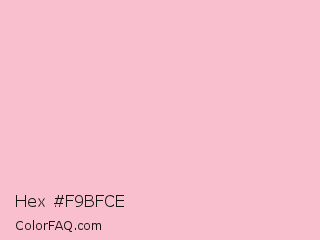 Hex #f9bfce Color is a very light rose color and the nearest color is Bubble Gum #ffc1cc. Hex code #f9bfce and RGB value is rgb(249,191,206). In RGB color space, this color is composed of 98% red, 75% green, 81% blue, In CMYK color space, this color is composed of 0% cyan, 23% magenta, 17% yellow , 2% black , In HSL color space, this color has a hue angle of 344° , 83% saturation and 86% lightness.