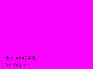 Hex #fa04fe Color is a normal magenta color and the nearest color is Magenta / Fuchsia #ff00ff. Hex code #fa04fe and RGB value is rgb(250,4,254). In RGB color space, this color is composed of 98% red, 2% green, 100% blue, In CMYK color space, this color is composed of 2% cyan, 98% magenta, 0% yellow , 0% black , In HSL color space, this color has a hue angle of 299° , 99% saturation and 51% lightness.