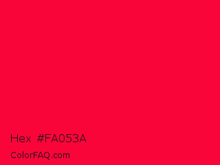 Hex #fa053a Color is a normal red color and the nearest color is American Rose #ff033e. Hex code #fa053a and RGB value is rgb(250,5,58). In RGB color space, this color is composed of 98% red, 2% green, 23% blue, In CMYK color space, this color is composed of 0% cyan, 98% magenta, 77% yellow , 2% black , In HSL color space, this color has a hue angle of 347° , 96% saturation and 50% lightness.