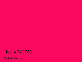 Hex #fa0760 Color is a normal rose color and the nearest color is Vivid Raspberry #ff006c. Hex code #fa0760 and RGB value is rgb(250,7,96). In RGB color space, this color is composed of 98% red, 3% green, 38% blue, In CMYK color space, this color is composed of 0% cyan, 97% magenta, 62% yellow , 2% black , In HSL color space, this color has a hue angle of 338° , 96% saturation and 50% lightness.