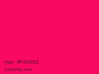 Hex #fa0962 Color is a normal rose color and the nearest color is Vivid Raspberry #ff006c. Hex code #fa0962 and RGB value is rgb(250,9,98). In RGB color space, this color is composed of 98% red, 4% green, 38% blue, In CMYK color space, this color is composed of 0% cyan, 96% magenta, 61% yellow , 2% black , In HSL color space, this color has a hue angle of 338° , 96% saturation and 51% lightness.