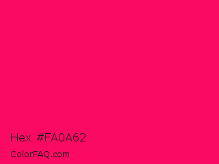 Hex #fa0a62 Color is a normal rose color and the nearest color is Vivid Raspberry #ff006c. Hex code #fa0a62 and RGB value is rgb(250,10,98). In RGB color space, this color is composed of 98% red, 4% green, 38% blue, In CMYK color space, this color is composed of 0% cyan, 96% magenta, 61% yellow , 2% black , In HSL color space, this color has a hue angle of 338° , 96% saturation and 51% lightness.