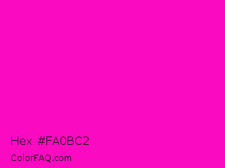 Hex #fa0bc2 Color is a normal magenta color and the nearest color is Shocking Pink #fc0fc0. Hex code #fa0bc2 and RGB value is rgb(250,11,194). In RGB color space, this color is composed of 98% red, 4% green, 76% blue, In CMYK color space, this color is composed of 0% cyan, 96% magenta, 22% yellow , 2% black , In HSL color space, this color has a hue angle of 314° , 96% saturation and 51% lightness.