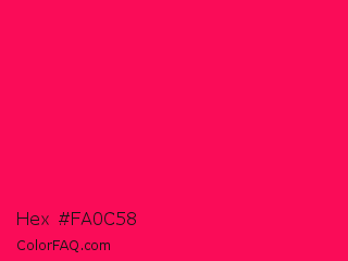 Hex #fa0c58 Color is a normal rose color and the nearest color is Folly #ff004f. Hex code #fa0c58 and RGB value is rgb(250,12,88). In RGB color space, this color is composed of 98% red, 5% green, 35% blue, In CMYK color space, this color is composed of 0% cyan, 95% magenta, 65% yellow , 2% black , In HSL color space, this color has a hue angle of 341° , 96% saturation and 51% lightness.