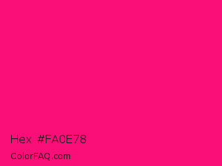 Hex #fa0e78 Color is a normal rose color and the nearest color is Winter Sky #ff007c. Hex code #fa0e78 and RGB value is rgb(250,14,120). In RGB color space, this color is composed of 98% red, 5% green, 47% blue, In CMYK color space, this color is composed of 0% cyan, 94% magenta, 52% yellow , 2% black , In HSL color space, this color has a hue angle of 333° , 96% saturation and 52% lightness.