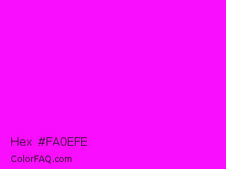Hex #fa0efe Color is a normal magenta color and the nearest color is Magenta / Fuchsia #ff00ff. Hex code #fa0efe and RGB value is rgb(250,14,254). In RGB color space, this color is composed of 98% red, 5% green, 100% blue, In CMYK color space, this color is composed of 2% cyan, 94% magenta, 0% yellow , 0% black , In HSL color space, this color has a hue angle of 299° , 99% saturation and 53% lightness.