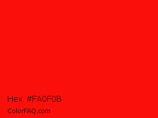 Hex #fa0f0b Color is a normal red color and the nearest color is Candy Apple Red #ff0800. Hex code #fa0f0b and RGB value is rgb(250,15,11). In RGB color space, this color is composed of 98% red, 6% green, 4% blue, In CMYK color space, this color is composed of 0% cyan, 94% magenta, 96% yellow , 2% black , In HSL color space, this color has a hue angle of 1° , 96% saturation and 51% lightness.