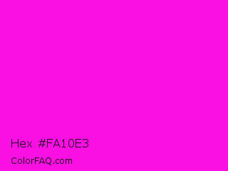 Hex #fa10e3 Color is a normal magenta color and the nearest color is Hot Magenta #ff1dce. Hex code #fa10e3 and RGB value is rgb(250,16,227). In RGB color space, this color is composed of 98% red, 6% green, 89% blue, In CMYK color space, this color is composed of 0% cyan, 94% magenta, 9% yellow , 2% black , In HSL color space, this color has a hue angle of 306° , 96% saturation and 52% lightness.