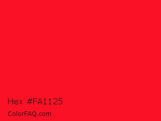Hex #fa1125 Color is a normal red color and the nearest color is Vivid Red #f70d1a. Hex code #fa1125 and RGB value is rgb(250,17,37). In RGB color space, this color is composed of 98% red, 7% green, 15% blue, In CMYK color space, this color is composed of 0% cyan, 93% magenta, 85% yellow , 2% black , In HSL color space, this color has a hue angle of 355° , 96% saturation and 52% lightness.