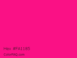 Hex #fa1185 Color is a normal rose color and the nearest color is Fluorescent Pink #ff1493. Hex code #fa1185 and RGB value is rgb(250,17,133). In RGB color space, this color is composed of 98% red, 7% green, 52% blue, In CMYK color space, this color is composed of 0% cyan, 93% magenta, 47% yellow , 2% black , In HSL color space, this color has a hue angle of 330° , 96% saturation and 52% lightness.