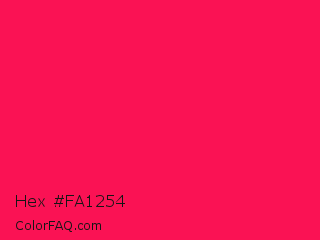 Hex #fa1254 Color is a normal rose color and the nearest color is Awesome #ff2052. Hex code #fa1254 and RGB value is rgb(250,18,84). In RGB color space, this color is composed of 98% red, 7% green, 33% blue, In CMYK color space, this color is composed of 0% cyan, 93% magenta, 66% yellow , 2% black , In HSL color space, this color has a hue angle of 343° , 96% saturation and 53% lightness.
