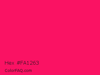 Hex #fa1263 Color is a normal rose color and the nearest color is Vivid Raspberry #ff006c. Hex code #fa1263 and RGB value is rgb(250,18,99). In RGB color space, this color is composed of 98% red, 7% green, 39% blue, In CMYK color space, this color is composed of 0% cyan, 93% magenta, 60% yellow , 2% black , In HSL color space, this color has a hue angle of 339° , 96% saturation and 53% lightness.