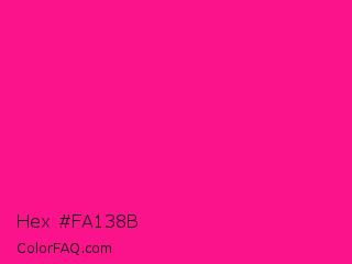 Hex #fa138b Color is a normal rose color and the nearest color is Fluorescent Pink #ff1493. Hex code #fa138b and RGB value is rgb(250,19,139). In RGB color space, this color is composed of 98% red, 7% green, 55% blue, In CMYK color space, this color is composed of 0% cyan, 92% magenta, 44% yellow , 2% black , In HSL color space, this color has a hue angle of 329° , 96% saturation and 53% lightness.