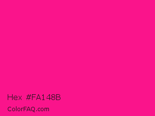 Hex #fa148b Color is a normal rose color and the nearest color is Fluorescent Pink #ff1493. Hex code #fa148b and RGB value is rgb(250,20,139). In RGB color space, this color is composed of 98% red, 8% green, 55% blue, In CMYK color space, this color is composed of 0% cyan, 92% magenta, 44% yellow , 2% black , In HSL color space, this color has a hue angle of 329° , 96% saturation and 53% lightness.