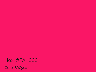Hex #fa1666 Color is a normal rose color and the nearest color is Awesome #ff2052. Hex code #fa1666 and RGB value is rgb(250,22,102). In RGB color space, this color is composed of 98% red, 9% green, 40% blue, In CMYK color space, this color is composed of 0% cyan, 91% magenta, 59% yellow , 2% black , In HSL color space, this color has a hue angle of 339° , 96% saturation and 53% lightness.
