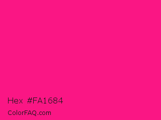 Hex #fa1684 Color is a normal rose color and the nearest color is Fluorescent Pink #ff1493. Hex code #fa1684 and RGB value is rgb(250,22,132). In RGB color space, this color is composed of 98% red, 9% green, 52% blue, In CMYK color space, this color is composed of 0% cyan, 91% magenta, 47% yellow , 2% black , In HSL color space, this color has a hue angle of 331° , 96% saturation and 53% lightness.