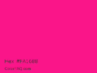 Hex #fa1688 Color is a normal rose color and the nearest color is Fluorescent Pink #ff1493. Hex code #fa1688 and RGB value is rgb(250,22,136). In RGB color space, this color is composed of 98% red, 9% green, 53% blue, In CMYK color space, this color is composed of 0% cyan, 91% magenta, 46% yellow , 2% black , In HSL color space, this color has a hue angle of 330° , 96% saturation and 53% lightness.