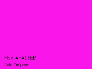 Hex #fa16eb Color is a normal magenta color and the nearest color is Magenta / Fuchsia #ff00ff. Hex code #fa16eb and RGB value is rgb(250,22,235). In RGB color space, this color is composed of 98% red, 9% green, 92% blue, In CMYK color space, this color is composed of 0% cyan, 91% magenta, 6% yellow , 2% black , In HSL color space, this color has a hue angle of 304° , 96% saturation and 53% lightness.