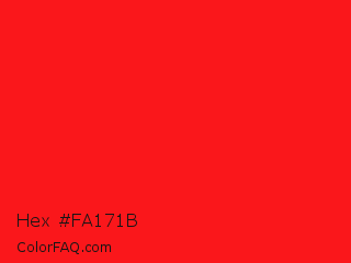 Hex #fa171b Color is a normal red color and the nearest color is Vivid Red #f70d1a. Hex code #fa171b and RGB value is rgb(250,23,27). In RGB color space, this color is composed of 98% red, 9% green, 11% blue, In CMYK color space, this color is composed of 0% cyan, 91% magenta, 89% yellow , 2% black , In HSL color space, this color has a hue angle of 359° , 96% saturation and 54% lightness.
