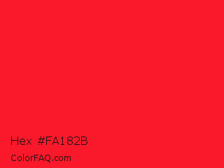 Hex #fa182b Color is a normal red color and the nearest color is Torch Red #fd0e35. Hex code #fa182b and RGB value is rgb(250,24,43). In RGB color space, this color is composed of 98% red, 9% green, 17% blue, In CMYK color space, this color is composed of 0% cyan, 90% magenta, 83% yellow , 2% black , In HSL color space, this color has a hue angle of 355° , 96% saturation and 54% lightness.