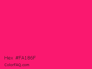 Hex #fa186f Color is a normal rose color and the nearest color is Vivid Raspberry #ff006c. Hex code #fa186f and RGB value is rgb(250,24,111). In RGB color space, this color is composed of 98% red, 9% green, 44% blue, In CMYK color space, this color is composed of 0% cyan, 90% magenta, 56% yellow , 2% black , In HSL color space, this color has a hue angle of 337° , 96% saturation and 54% lightness.