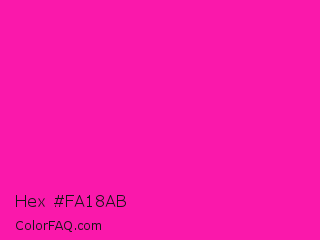 Hex #fa18ab Color is a normal magenta color and the nearest color is Persian Rose #fe28a2. Hex code #fa18ab and RGB value is rgb(250,24,171). In RGB color space, this color is composed of 98% red, 9% green, 67% blue, In CMYK color space, this color is composed of 0% cyan, 90% magenta, 32% yellow , 2% black , In HSL color space, this color has a hue angle of 321° , 96% saturation and 54% lightness.