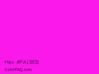 Hex #fa18eb Color is a normal magenta color and the nearest color is Hot Magenta #ff1dce. Hex code #fa18eb and RGB value is rgb(250,24,235). In RGB color space, this color is composed of 98% red, 9% green, 92% blue, In CMYK color space, this color is composed of 0% cyan, 90% magenta, 6% yellow , 2% black , In HSL color space, this color has a hue angle of 304° , 96% saturation and 54% lightness.