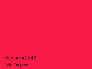 Hex #fa1b48 Color is a normal red color and the nearest color is Awesome #ff2052. Hex code #fa1b48 and RGB value is rgb(250,27,72). In RGB color space, this color is composed of 98% red, 11% green, 28% blue, In CMYK color space, this color is composed of 0% cyan, 89% magenta, 71% yellow , 2% black , In HSL color space, this color has a hue angle of 348° , 96% saturation and 54% lightness.
