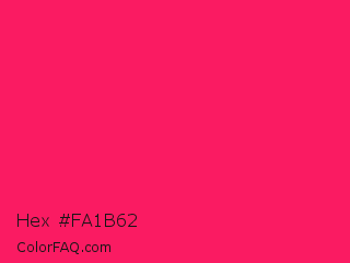Hex #fa1b62 Color is a normal rose color and the nearest color is Awesome #ff2052. Hex code #fa1b62 and RGB value is rgb(250,27,98). In RGB color space, this color is composed of 98% red, 11% green, 38% blue, In CMYK color space, this color is composed of 0% cyan, 89% magenta, 61% yellow , 2% black , In HSL color space, this color has a hue angle of 341° , 96% saturation and 54% lightness.