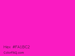 Hex #fa1bc2 Color is a normal magenta color and the nearest color is Shocking Pink #fc0fc0. Hex code #fa1bc2 and RGB value is rgb(250,27,194). In RGB color space, this color is composed of 98% red, 11% green, 76% blue, In CMYK color space, this color is composed of 0% cyan, 89% magenta, 22% yellow , 2% black , In HSL color space, this color has a hue angle of 315° , 96% saturation and 54% lightness.
