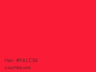 Hex #fa1c36 Color is a normal red color and the nearest color is Torch Red #fd0e35. Hex code #fa1c36 and RGB value is rgb(250,28,54). In RGB color space, this color is composed of 98% red, 11% green, 21% blue, In CMYK color space, this color is composed of 0% cyan, 89% magenta, 78% yellow , 2% black , In HSL color space, this color has a hue angle of 353° , 96% saturation and 55% lightness.