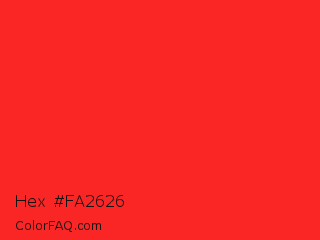 Hex #fa2626 Color is a normal red color and the nearest color is Red Pigment #ed1c24. Hex code #fa2626 and RGB value is rgb(250,38,38). In RGB color space, this color is composed of 98% red, 15% green, 15% blue, In CMYK color space, this color is composed of 0% cyan, 85% magenta, 85% yellow , 2% black , In HSL color space, this color has a hue angle of 0° , 95% saturation and 56% lightness.