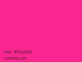 Hex #fa2690 Color is a normal rose color and the nearest color is Wild Strawberry Crayola #ff3399. Hex code #fa2690 and RGB value is rgb(250,38,144). In RGB color space, this color is composed of 98% red, 15% green, 56% blue, In CMYK color space, this color is composed of 0% cyan, 85% magenta, 42% yellow , 2% black , In HSL color space, this color has a hue angle of 330° , 95% saturation and 56% lightness.