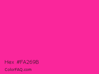 Hex #fa269b Color is a normal magenta color and the nearest color is Persian Rose #fe28a2. Hex code #fa269b and RGB value is rgb(250,38,155). In RGB color space, this color is composed of 98% red, 15% green, 61% blue, In CMYK color space, this color is composed of 0% cyan, 85% magenta, 38% yellow , 2% black , In HSL color space, this color has a hue angle of 327° , 95% saturation and 56% lightness.